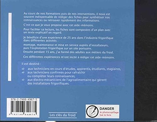 Au cours de nos formations puis de nos interventions, il nous est souvent indispensable de rédiger des fiches pour synthétiser nos connaissances ou retrouver rapidement des informations. C'est ce que je vous propose avec cet aide-mémoire. Pour faciliter sa lecture, les fiches sont composées d'un plan avec un texte explicatif en regard. je bénéficie d'une expérience de 25 ans dans l'industrie frigorifique dans différentes activités montage, maintenance et mise en service auprès d'installateurs, puis l'exploitation frigorifique sur un site portuaire. Ensuite pendant 15 ans, j'ai formé des adultes aux métiers du froid. Ces différentes expériences m'ont incité à rédiger cet aide-mémoire.